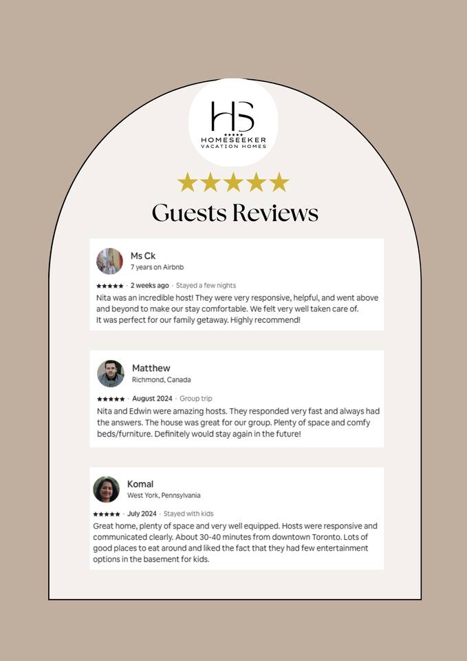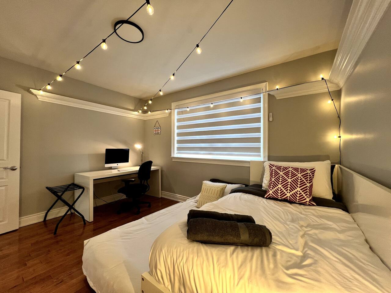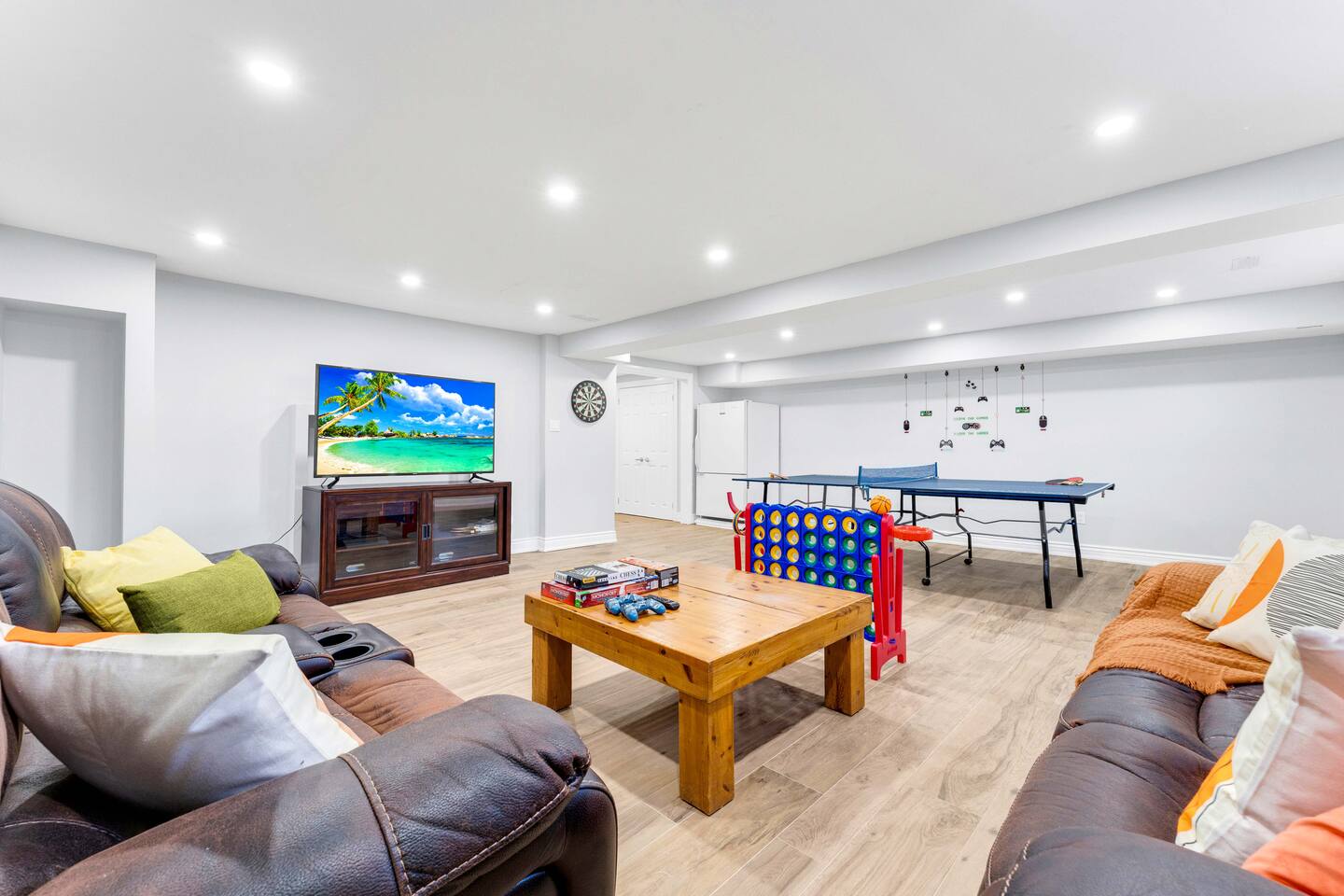 ★ KEY FEATURES ★ ✔ PRIME LOCATION close to 401 & Airport ✔ Over 2,000+ sqft of space ample for families and groups ✔ Professionally Cleaned ✔ Highspeed WiFi connection ✔ Smart TVs w/ Steaming Apps ✔ Self Check-in ✔ 2x Dedicated Workspace ✔ Coffee & Tea Bar ✔ Fresh towels, & bathroom essentials provided ✔ Fully equipped Kitchen ✔ Parking on the premises (up to 6 cars) ★ ENTERTAINMENT KIDS ROOM ★ ✔ Ping Pong Table ✔ Full Size Connect 4 ✔ Jenga and other board games ✔ PS5 with 2 controllers ✔ Reclinable Sofas perfect for Movie Night ✔ 55" Smart Flat-Screen TV with Netflix, YouTube, and more! ★ KITCHEN & DINING ★ The kitchen area with numerous cooking appliances and spacious countertops. If you want to take a break from restaurants, then this is the place for you. ✔ Microwave ✔ Stove ✔ Oven ✔ Refrigerator/Freezer ✔ Dishwasher ✔ Toaster ✔ Sink - Hot & Cold Water ✔ Silverware ✔ Pots & Pans A cozy dining table is woven between the kitchen and the living room. It is perfect for those who want to enjoy a delicious family meal. ✔ Dining Table with 8 Chairs & Bench ✔ Suitable for Laptop Work & Meetings also ✔ High chair (stored by the front door closet) ★ LIVING ROOM ★ It is nestled in the main floor living area. It is ideal for relaxing and enjoying the company of friends and family ✔ Comfortable Sofas with Pillows & Throws ✔ Coffee Table ✔ Bar Seating for 2 ★ SLEEPING ARRANGEMENTS ★ Corner Master Bedroom ✔ Queen Size Bed ✔ Pack n' Play Crib King Family Bedroom ✔ Single Size Bed ✔ King Size Bed Boho Bedroom ✔ Double Size Bed Starry Night Bedroom ✔ Single Size Pull out Beds ★ BACKYARD GREEN SPACE★ A nice new lawn for you to hang out and soak up the sun. ✔ Private ✔ Fully Fenced ★ DRIVEWAY & PARKING ★ ✔ 6 cars on the driveway ✔ Additional free street parking around the block (check signs, park at your own risk) ★☆ Book Today & Let Us Take Care Of You In Toronto! ☆★